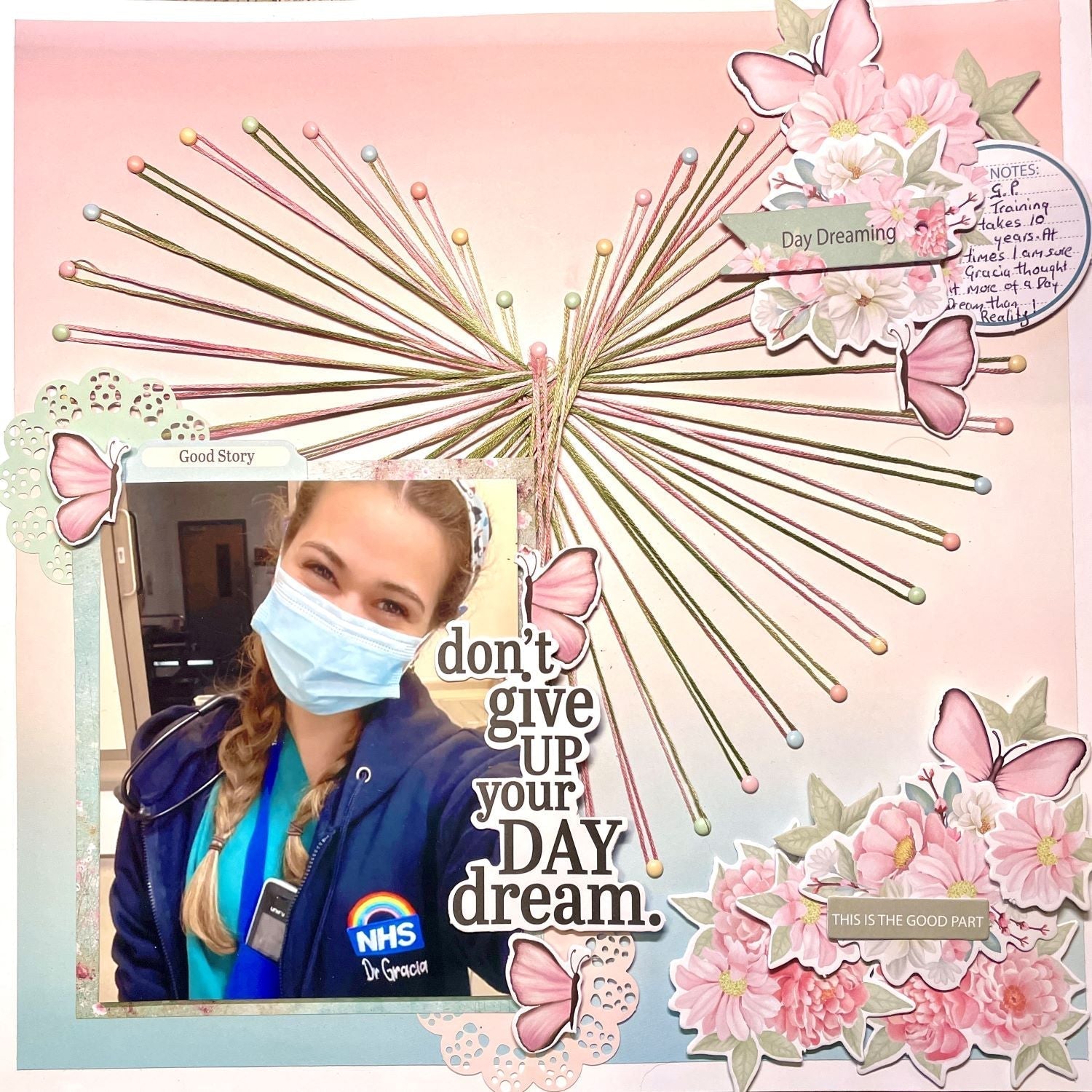 I knew how I wanted this layout to look but didn't have a photo in mind and whilst flicking through my printed photos came across this one, from several years ago, when Gracia was only a few years into her training. I knew that the 'Don't give up on your Day dream' creative cut title would be perfect as the training to become a G.P. is 10 years and I am sure that when Gracia started it seemed more like a daydream than a possibility!