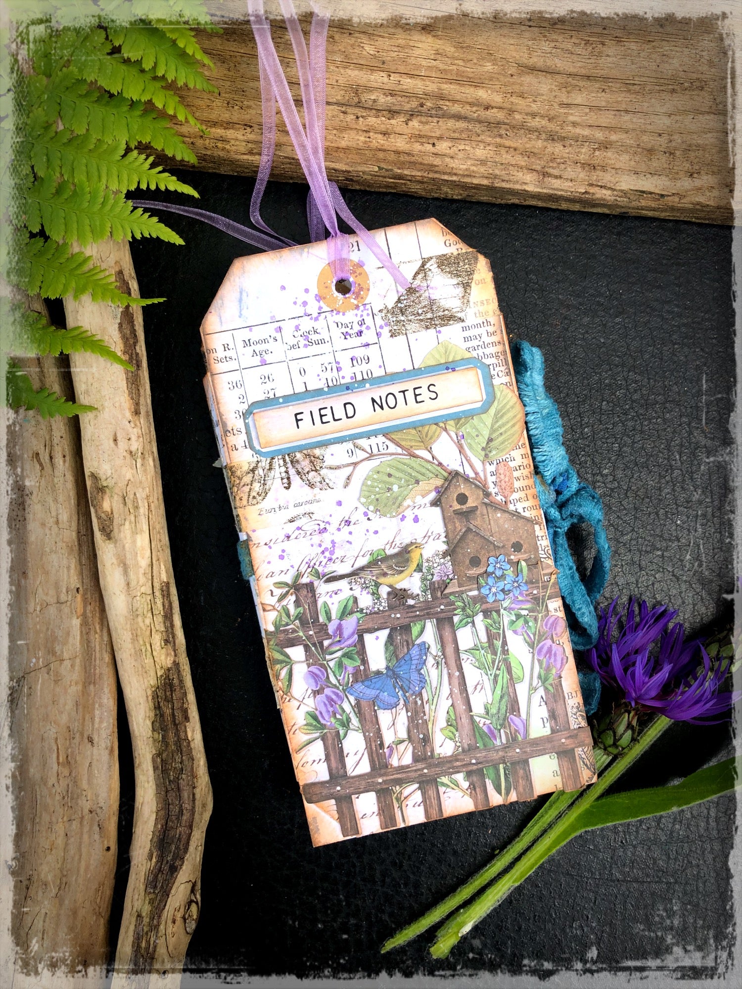 Using more ephemera and some Washi tape, I made a little book to put in the deep pocket/compartment. And a tag to slide into the opposite page/tag.
