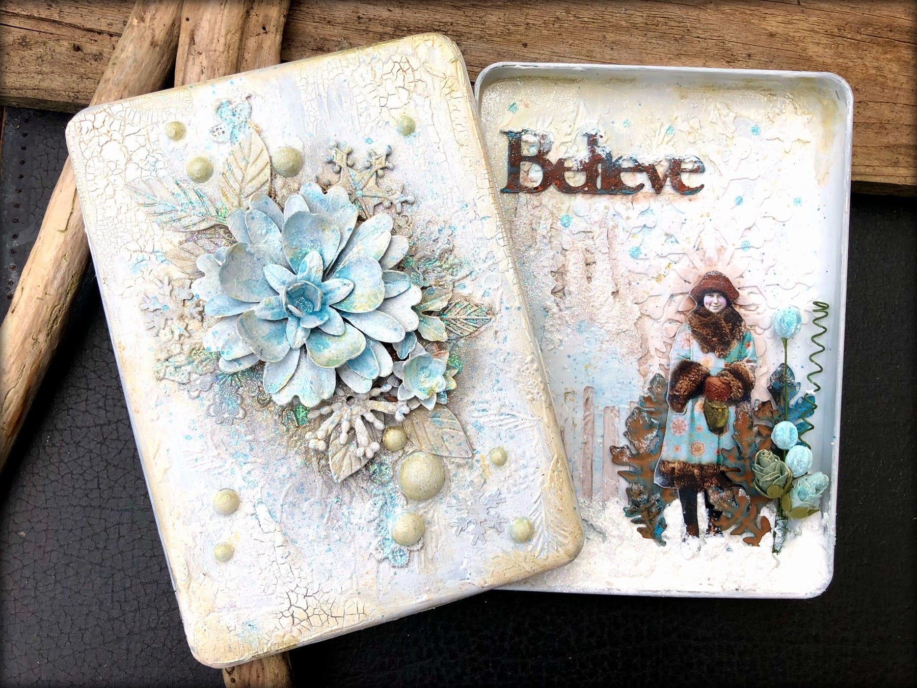I didn’t have any appropriate chipboard words (because I hadn’t planned on making this lol). I’d have preferred to use chipboard. But I did have the silver coloured metal “Believe” that I got from a friend a few years ago. I sanded it, coated it in gesso then used rust pastes to try and make it match my little Finnabair leaves. Finishing touch of some snow on top of the “Believe” and it was done… well, obviously I had to sprinkle more glitter around just to make it magical, but then it was done … probably! Maybe! I have a habit of returning to projects and fiddling with them. I’m thinking a few touches of white on the blue flowers might be needed. We shall see!