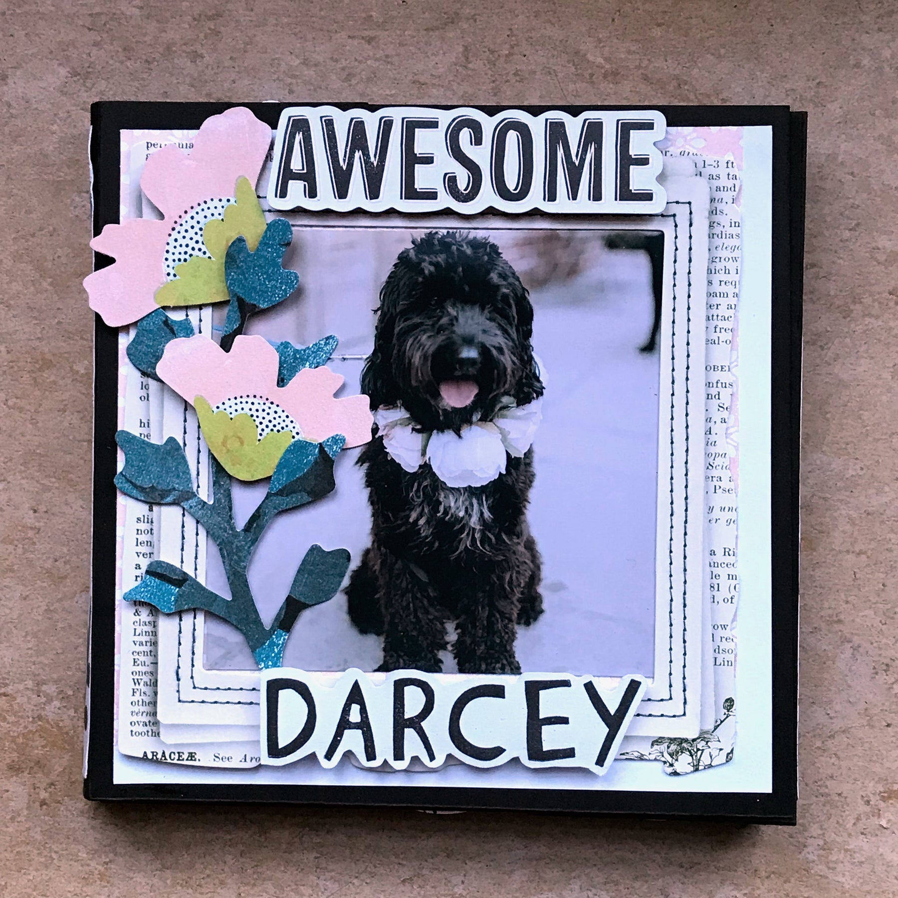 I made an album from black cardstock (not my design but instructions for similar ones can be found on Pinterest) and then used Vicki Boutin Printshop papers and die-cut flowers to decorate it. I also used a stitched frame to the front.