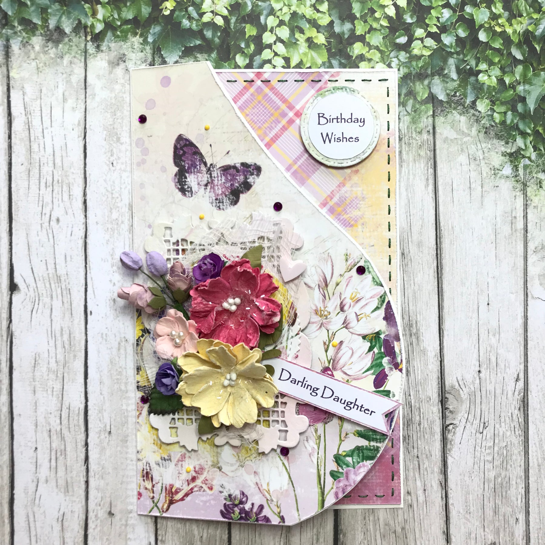 Firstly apologies for the next 2 photos I took them in the evening! I gathered together flowers and leaves that would coordinate with the papers (if ever you're stuck always contact Janine before placing your order and she will put you right as she has me several times), I also used a die to cut a doily to place them on from the papers already used and a disc for the centre. I printed out a couple of sentiments and layered them on to cardstock.