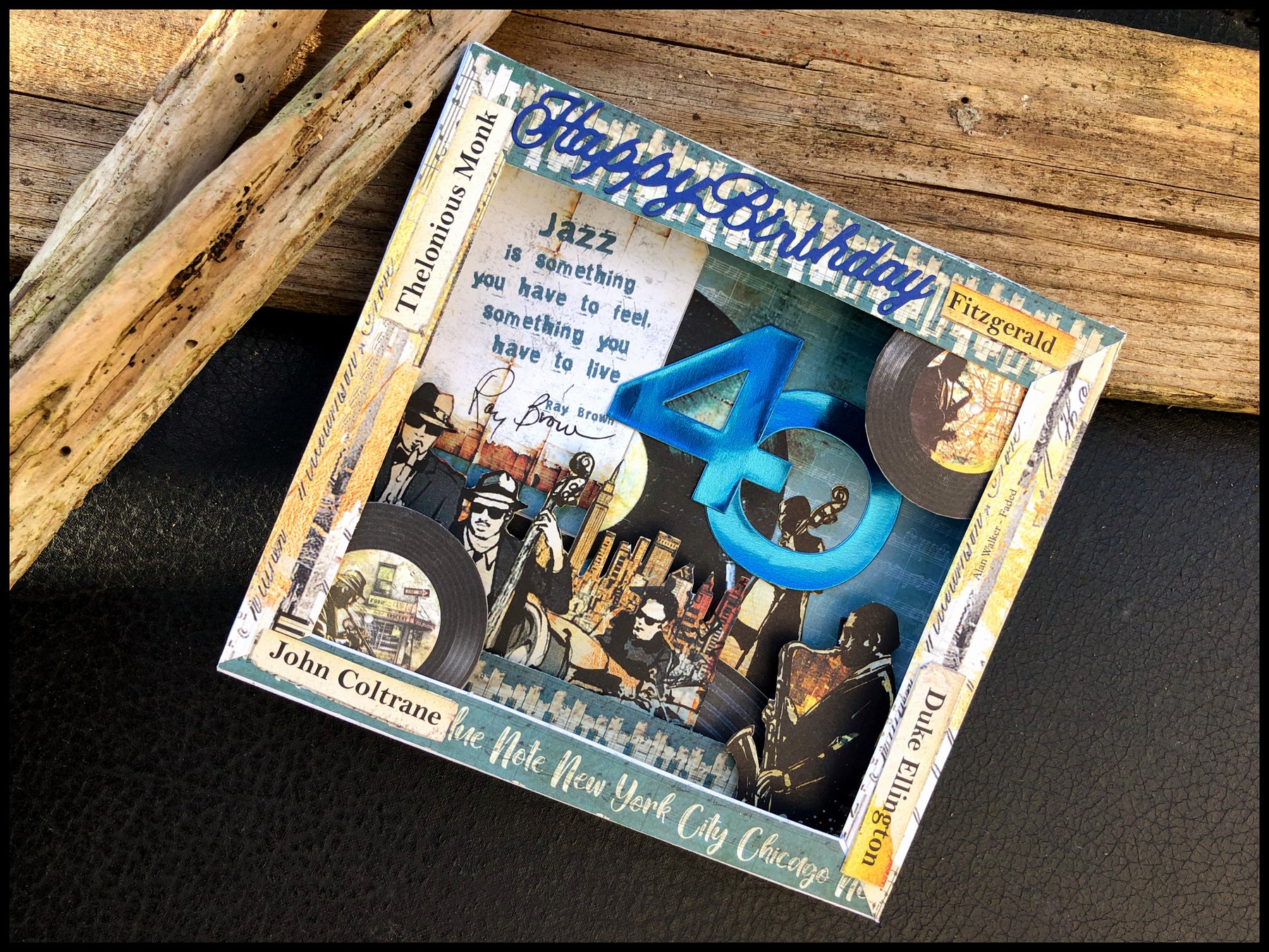 I made a little box card by simply cutting out some interesting bits from the paper and built a little jazz scene inside the box by using layers of 3D foam tape.
