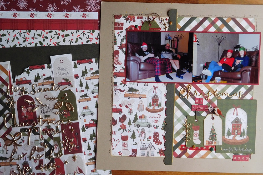 Hello Mad Scrappers! Amanda here with a new scrapbook page recording Christmas 2020. Our corner of the country was plunged into Tier 4 restrictions with ‘Christmas bubbles’ being abolished so it was a very quiet one and I’ll only be making a single 12x12 page. I chose Carta Bella’s Hello Christmas collection for my December scrapping as I am a big fan of traditional red and green collections. The 12x12 has sold out now unfortunately, but the 6x6 pad is still available in the shop along with two different ephemera packs and the enamel dots.