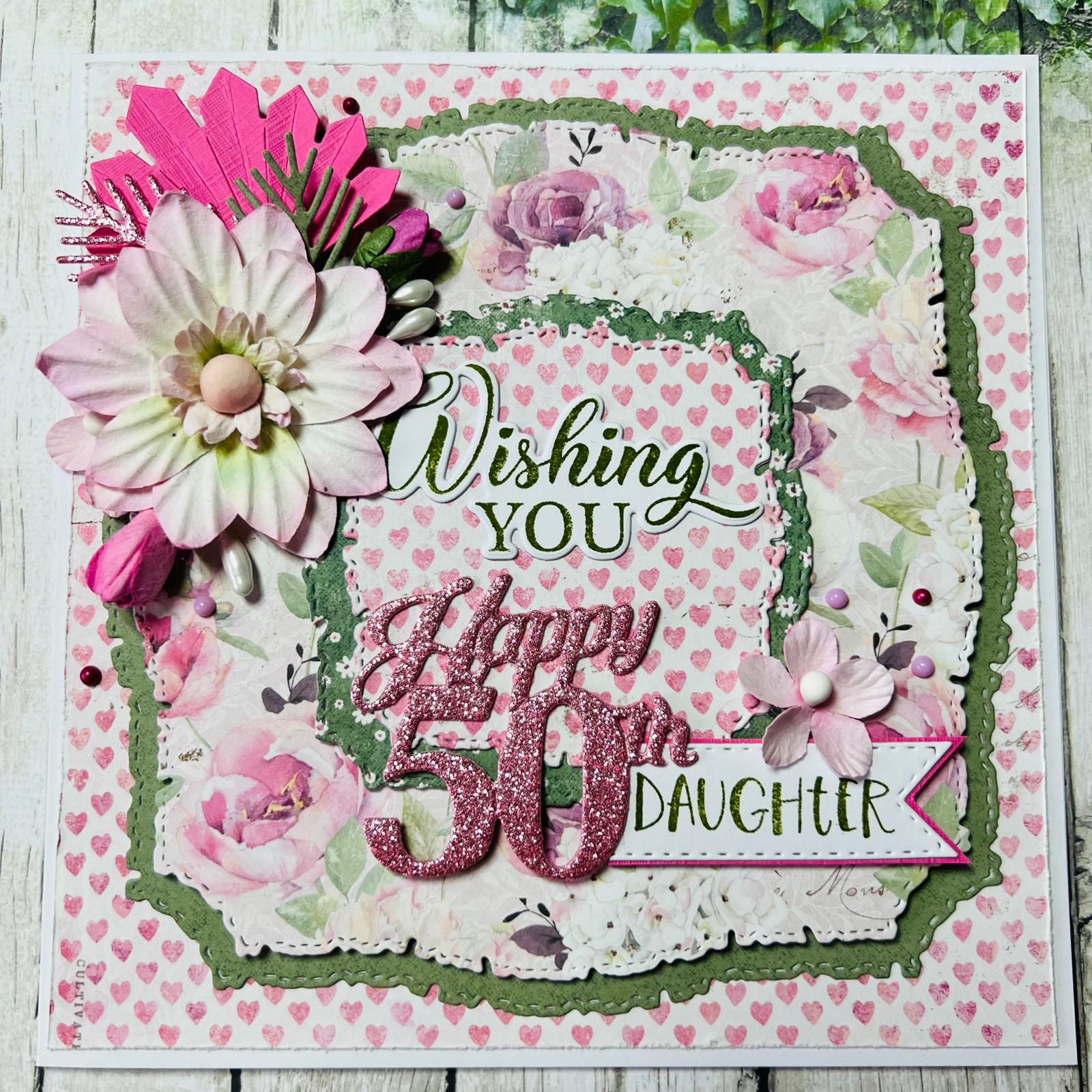 I knew I wanted to use some glitter and thought the 50 had to be done in it. I used a bright pink to cut the fan leaf and green and glitter for the sprigs. I tucked them under the sentiment mat.