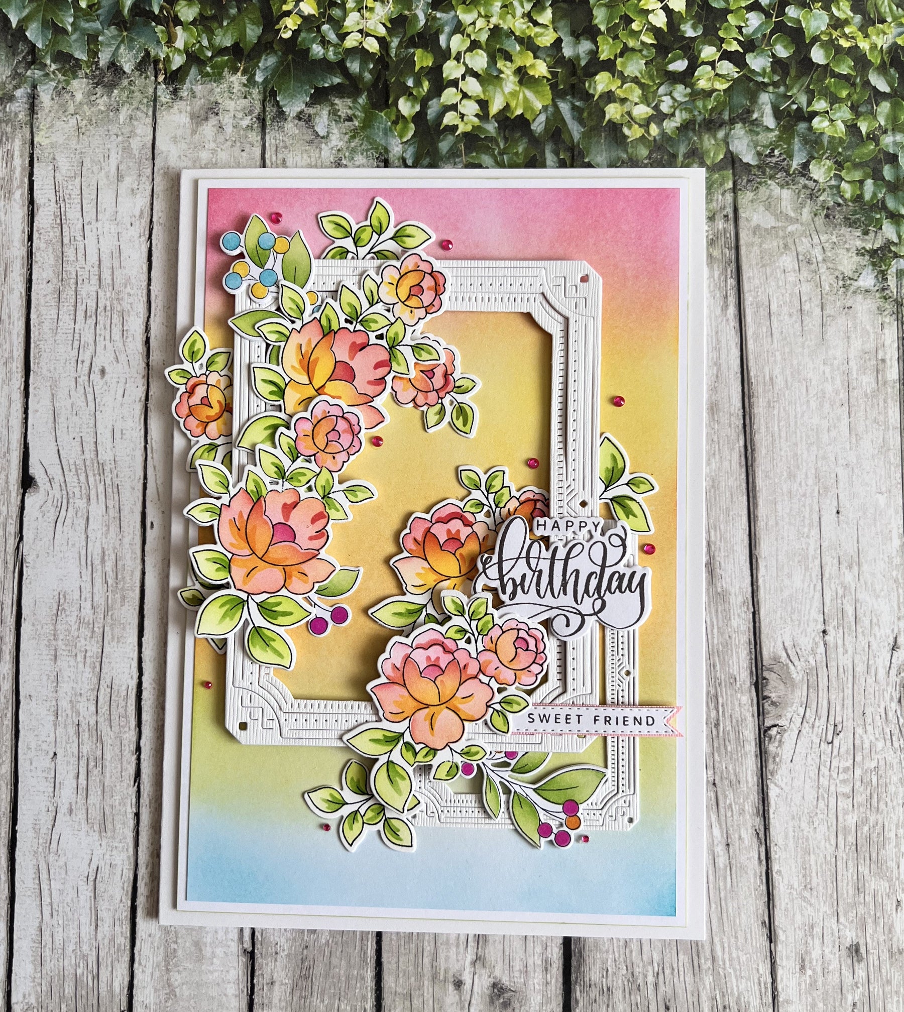 I trimmed down the background to leave a small edge to a 6x8 white card blank I made with Bazzill card stock. Then using another white I cut out both frames from the PinkFresh Art Deco Frames attaching the smaller one flat but adding the skinny foam strips to the larger one in the centre - you can see the 3 decorative parts of the frame are loose only attached in a few places. Then I lay my flowers and a couple of the berry branches both above and below the frame.