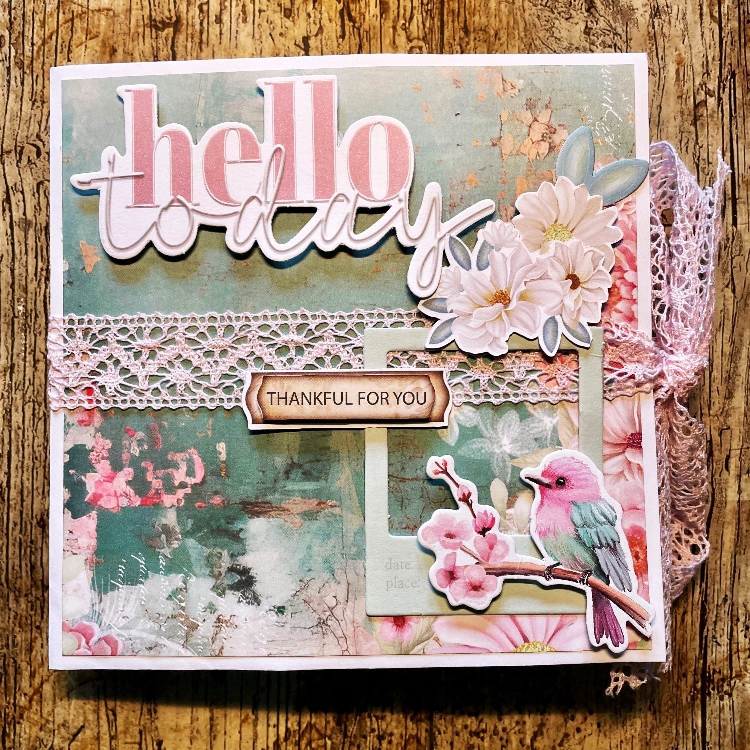 To finish I added a piece of pink lace to secure the album shut and decorated the covers and pages using While Away and Daydream Creative Cuts and pieces fussy cut from the 6 x 6 paper pad. My photos are going to be added behind the tags and on the white photo mats.