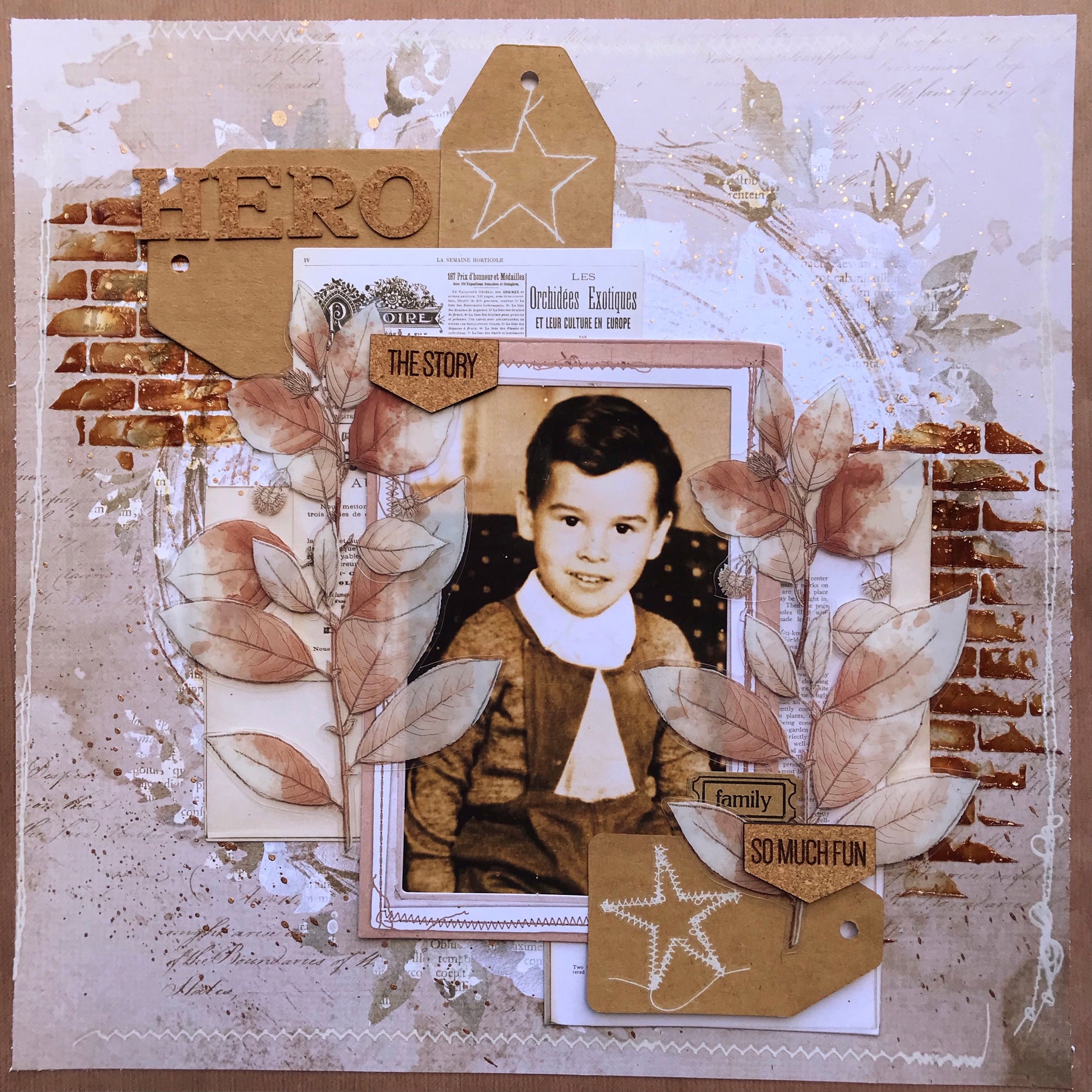 To this I added another small tag, and a ticket (both from my own supplies), some Toast Acetate Leaves, my photo and some cork tags (own supplies). The cork letters I used for my title were also from some very old stash.