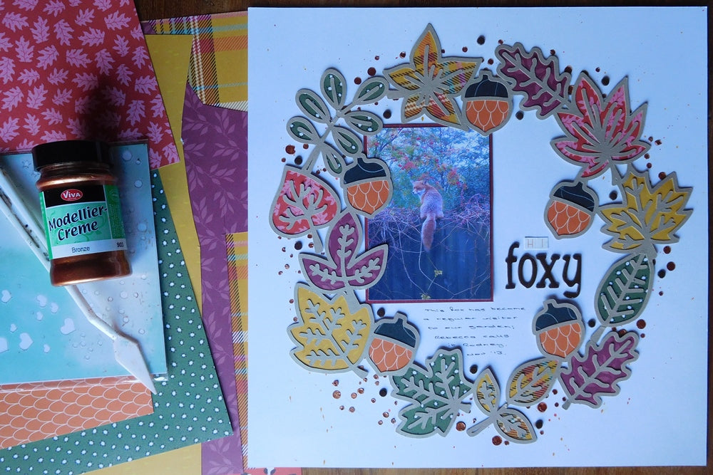 Once my modelling cream was dry (it doesn’t take long), I rubbed out the pencil line, spattered peach and yellow mists around my circle and left it to dry again before placing the wreath over the top. I matted my photo, a fox which was a regular visitor to our garden a few years ago, on red cardstock and tucked it into the wreath. I used old letter stickers from my stash for my title and added lots of dots from the Thickers sheet to the circle around the page. I considered enamel dots or pearls first, but I found that they distracted from the lustre of my bronze confetti and the ‘dullness’ of the Thickers dots worked better.