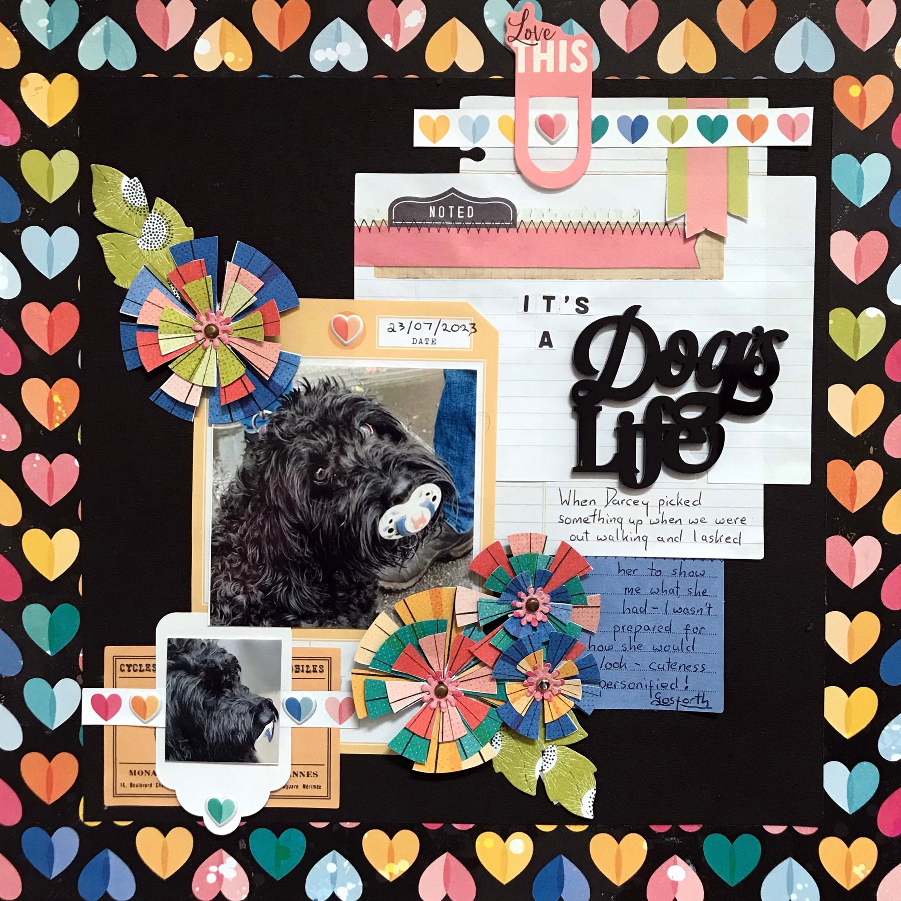 I started my page by making a cluster at the top right using elements from the Paperie pack, the heart branding strip, a paper clip and a puffy heart. The 'It's A' text was trimmed from one of the phrase sheets, also from the Paperie pack. (Dog's Life was from my own supplies).