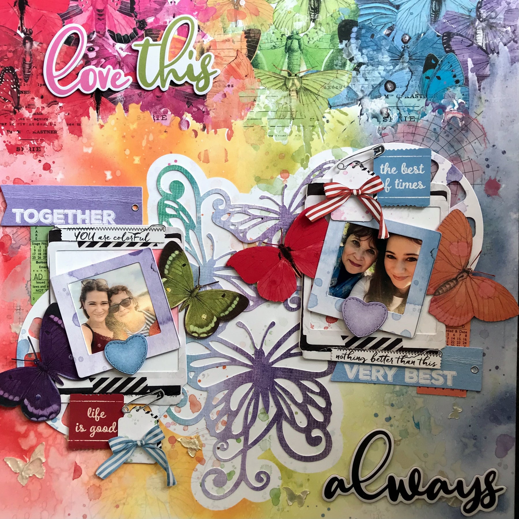 After removing the masks and adding my butterfly flourish I embellished the layout using rub-ons, laser cut butterflies, laser cut ephemera and pieces from the ephemera pack. I used words from the die-cut words pack for my title.