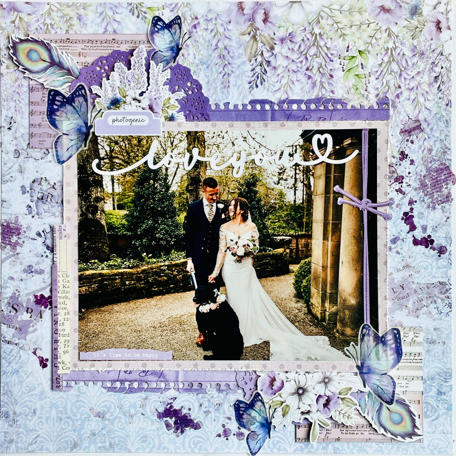 Although our daughter married over two years ago, I still get so much pleasure making scrapbook pages of her wedding. All of these pages have photos I have scrapped at least once, previously. The purple of the papers were so perfect for my photos. I am loving large photos at the moment and this is an 8” x 6” one.