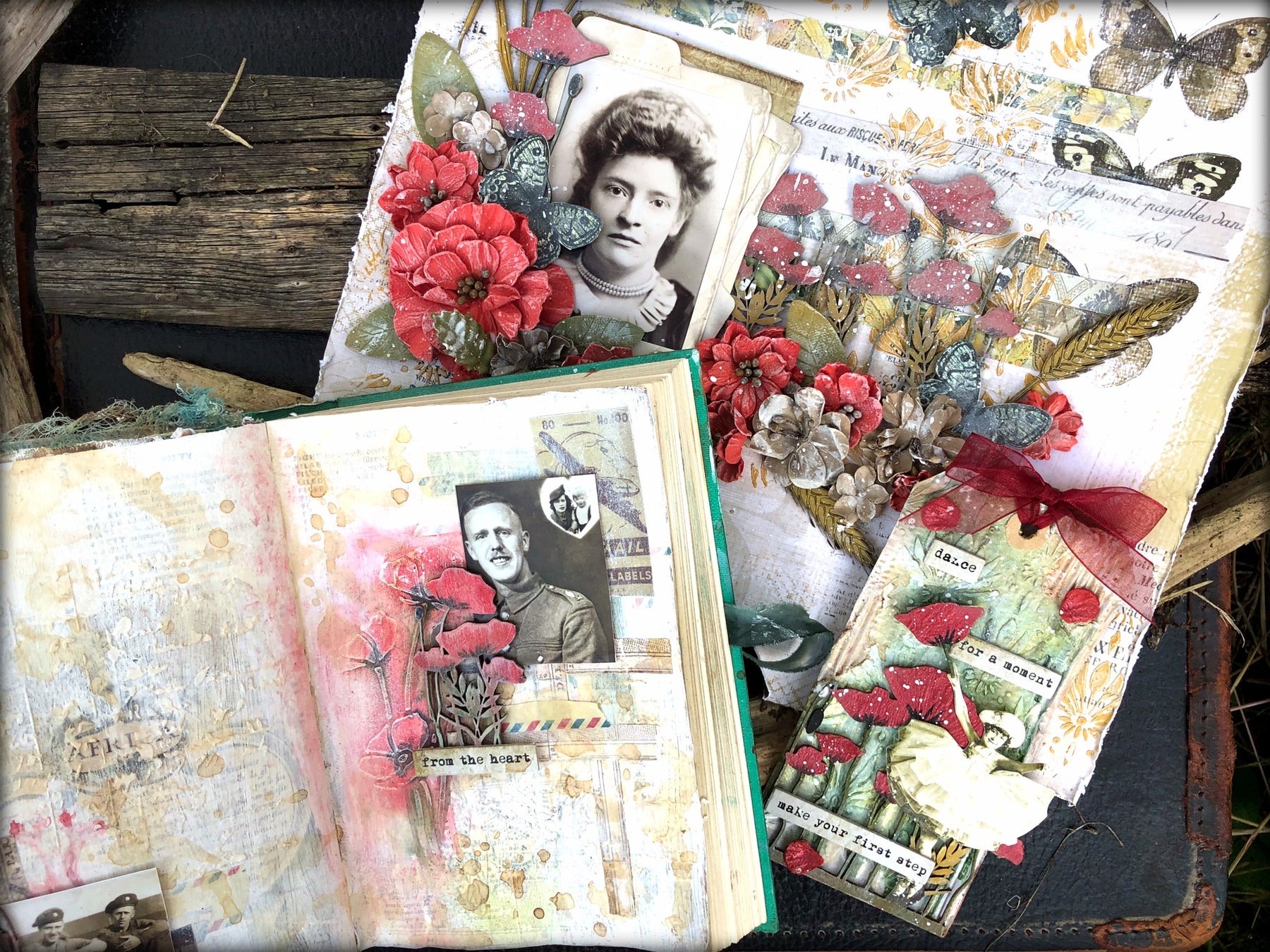 I’ve done a similar thing with the poppies as last time but I didn’t paint on white gesso first. I let the paint soak in so there’s a more muted feel to the colours. The poppies go so well with the dusty attic wheat.