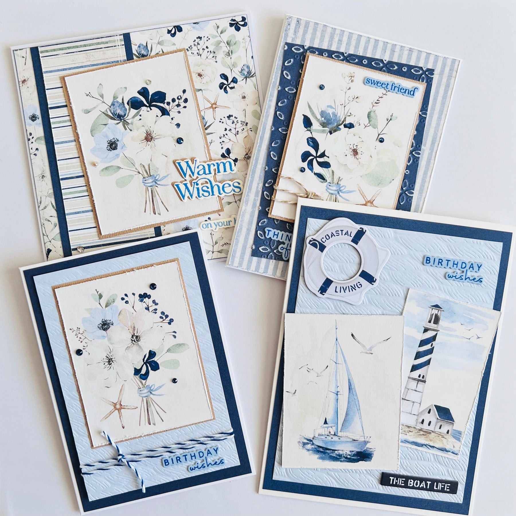 Today I am sharing some cards I have made for The Mad Scrapper Blog using a selection of beautiful papers by Maja Design all available in store at writing this post along with other beauties. My husband loves the sea and sailing so these papers were ideal to make him an anniversary card. I also decided to make some others to show you how versatile this collection is. Here is the card I made him: