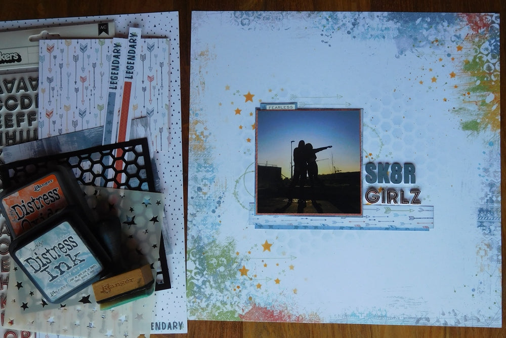 I mentioned last time that I wanted to use both sides of the Offbeat paper as backgrounds, and I’m using the front today, a white paper with multi-coloured distressed patterns around the edges. I love the grungy look of this paper and paired it with a photo of my daughter and her friend on roller skates at sunset.