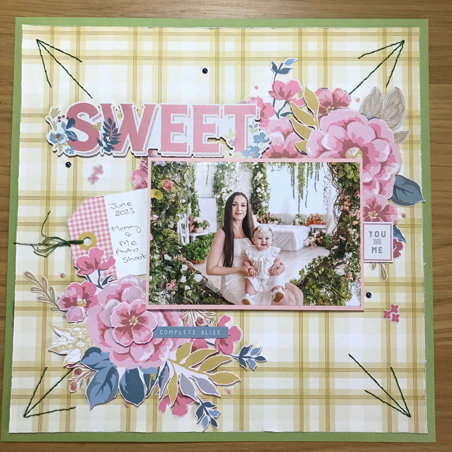 I mounted the photo on to some pink card giving a nice nod to the flowers around the girls. I knew I wanted to use the BIG sticker from the sheet that comes with the pad but didn't quite know where I was going to place it so I put it on white paper and cut tightly around it. One of the sheets is full of pretty top tags so I added one of those with the tiny bit of journaling on it. The photo has a piece of chipboard under it which allows me to tuck embellishments underneath.