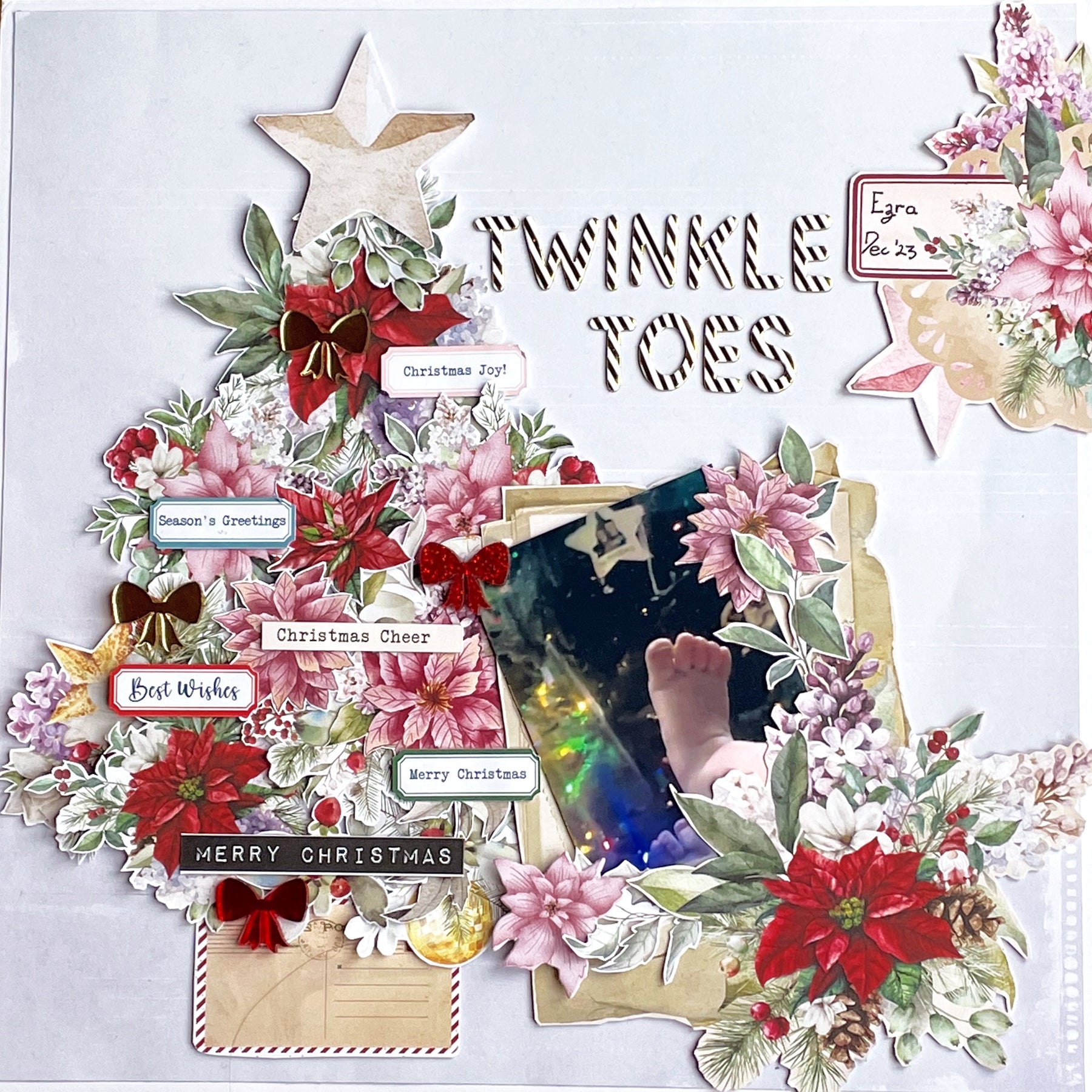 This year was our baby grandson's first Christmas and as you can imagine we have so many lovely photos of him over the festive period. I especially loved a little video our daughter sent us of him laying under the Christmas tree and kicking his little legs. I took a screen shot and as the quality wasn't very good printed it out small to use for this layout.