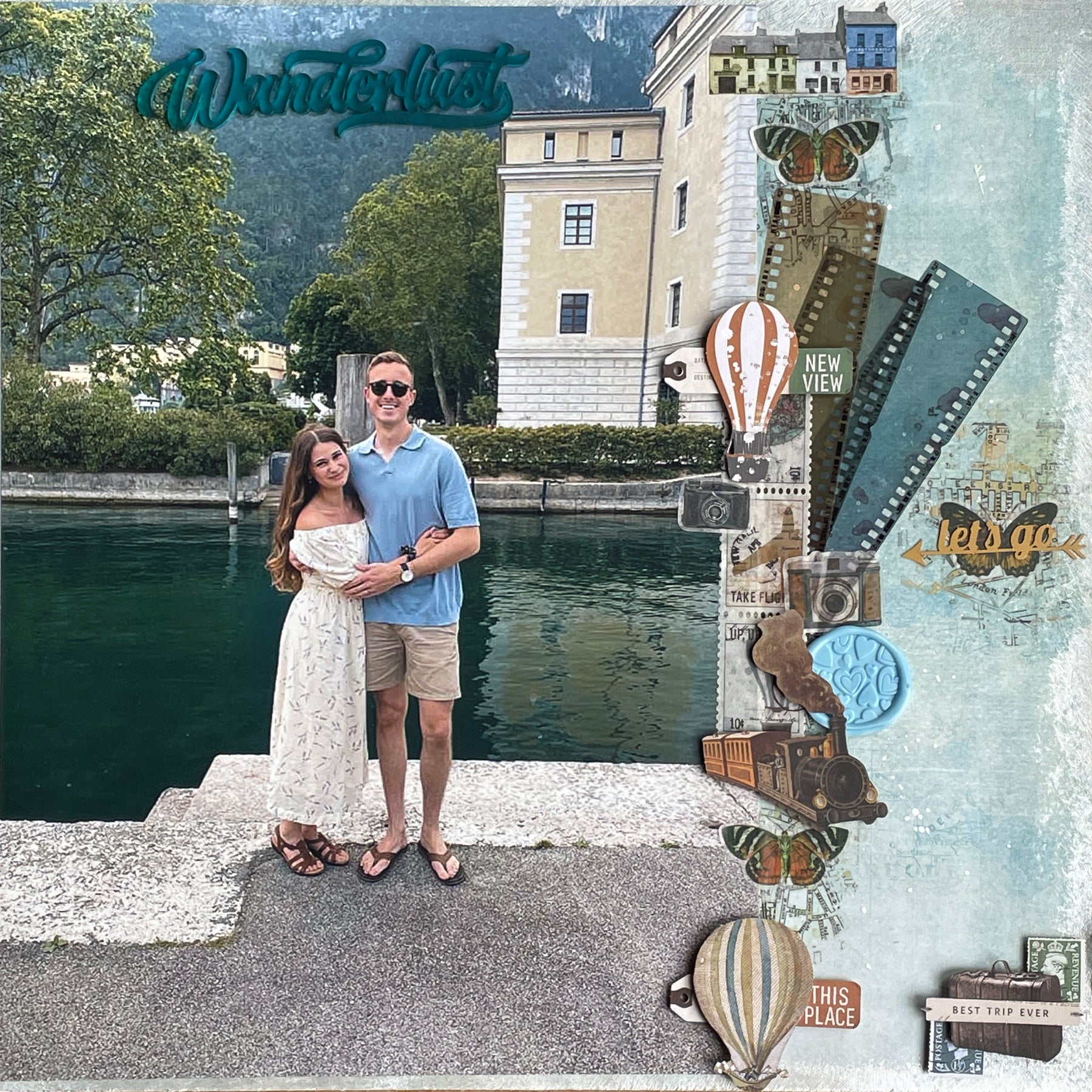 I taught a class, recently, where the focus was on using different sized photographs. I had forgotten how much I love large photos being the focal point of a layout and so ordered several more A4 photos to scrap. This one is of our daughter and her husband, when they were on honeymoon a couple of years ago.