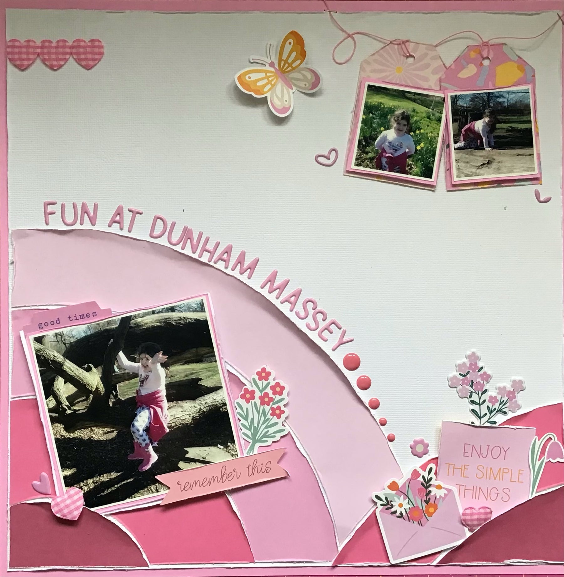 I added my large photo to the bottom left of the page, tucking one corner into the arches in the rainbow, I used flowers and phrases from the ephemera pack.