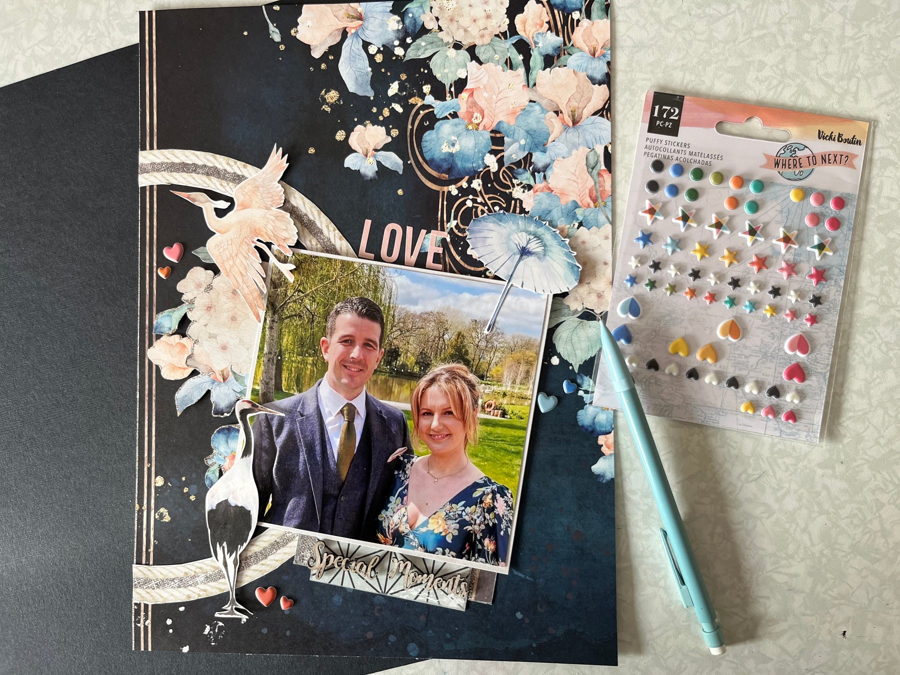 Add puffy hearts from the Vicki Boutin Where to Next stickers.