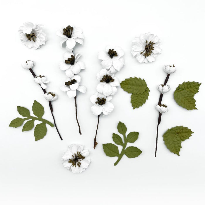 Pack includes 12 separate pieces. The assortment includes 3 individual flowers that measure 1.75 inches wide; 2 floral stems with 3 flowers; 2 stem pieces with 3 buds; 3 clusters of 2-leaves and 2 die-cut leaf pieces. Flowers are handmade. Slight variations in craftsmanship are expected. Comes in a variety of colors. Each sold separately. Imported.